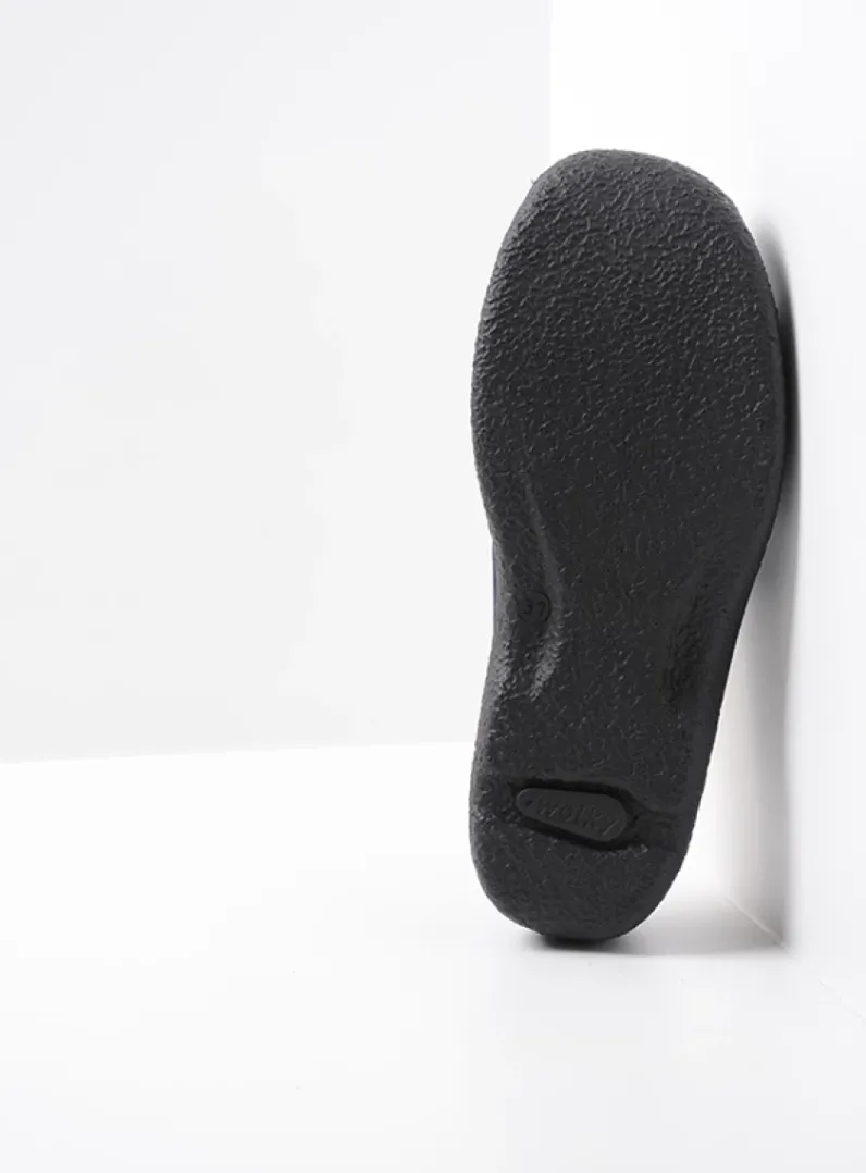 Deze muil uit de Roll Moc-lijn is bij veel Wolky-draagsters favoriet en dat is niet zo gek want je schiet er makkelijk even in. We horen dan ook dat veel dames ’m bij de deur hebben staan, om even de moestuin in te lopen of even wat in de container te gooien. Maar gebruik de Roll Slide ook zeker voor een wandeling. Door de oplopende neus die zo herkenbaar is bij alle Roll Moc-modellen rolt de voet als vanzelf af. De mocassin-maakwijze (handwerk!) zorgt ervoor dat de schoen van binnen lekker zacht aanvoelt. De naden liggen door deze maakwijze namelijk aan de buitenkant en daardoor heb je geen vervelende randen en stiksels aan de binnenkant.Let op: doordat de naden zichtbaar bovenop het voorblad liggen is het verstandig om bij nat weer de schoenen goed in te spuiten met een waterafstotende spray.