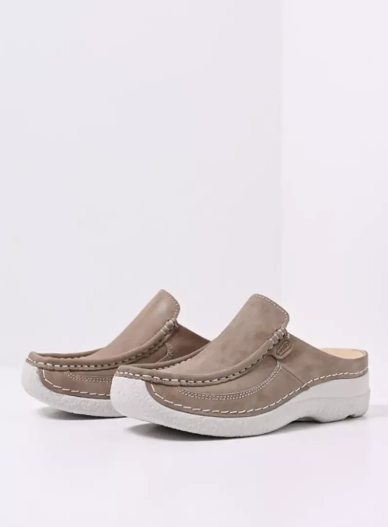 Deze muil uit de Roll Moc-lijn is bij veel Wolky-draagsters favoriet en dat is niet zo gek want je schiet er makkelijk even in. We horen dan ook dat veel dames ’m bij de deur hebben staan, om even de moestuin in te lopen of even wat in de container te gooien. Maar gebruik de Roll Slide ook zeker voor een wandeling. Door de oplopende neus die zo herkenbaar is bij alle Roll Moc-modellen rolt de voet als vanzelf af. De mocassin-maakwijze (handwerk!) zorgt ervoor dat de schoen van binnen lekker zacht aanvoelt. De naden liggen door deze maakwijze namelijk aan de buitenkant en daardoor heb je geen vervelende randen en stiksels aan de binnenkant.Let op: doordat de naden zichtbaar bovenop het voorblad liggen is het verstandig om bij nat weer de schoenen goed in te spuiten met een waterafstotende spray.