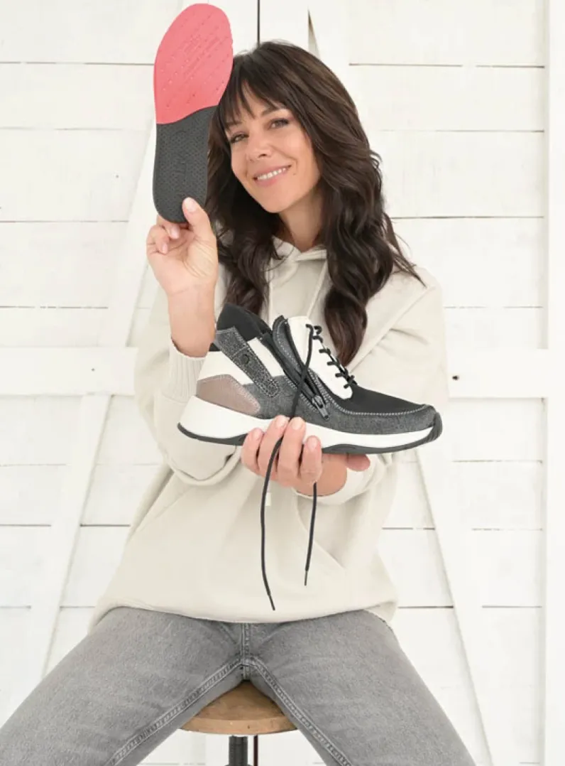 Wolky’s Crown S2F staat garant voor optimaal loopplezier. De zool combineert het beste van twee werelden: de lichtheid en demping van zacht PU en de slijtvastheid van TPU. De hogere hakstand zorgt ervoor dat je vanzelf de juiste houding aanneemt; hierdoor voorkom je allerlei (voet)kwalen. De neus van de Crown S2F is vrij rond, zo hebben je tenen genoeg ruimte. Deze boot heeft zowel een veter als een rits. Hierdoor is de Crown S2F makkelijk aan en uit te doen. De combinatie S2F achter de naam staat voor Stretch2Fit en dit geeft aan dat het voorblad is gemaakt van stretchmateriaal. Dit loopt door tot hoog op de wreef. Zo past deze schoen zich perfect aan diverse soorten voeten aan. Hoge wreef? Hallux valgus? Vergroeide tenen? Het stretchmateriaal rekt mee waar de voet dat nodig heeft. En kijk ook nog eens even naar de looks; een kek en sportief bootje, toch!